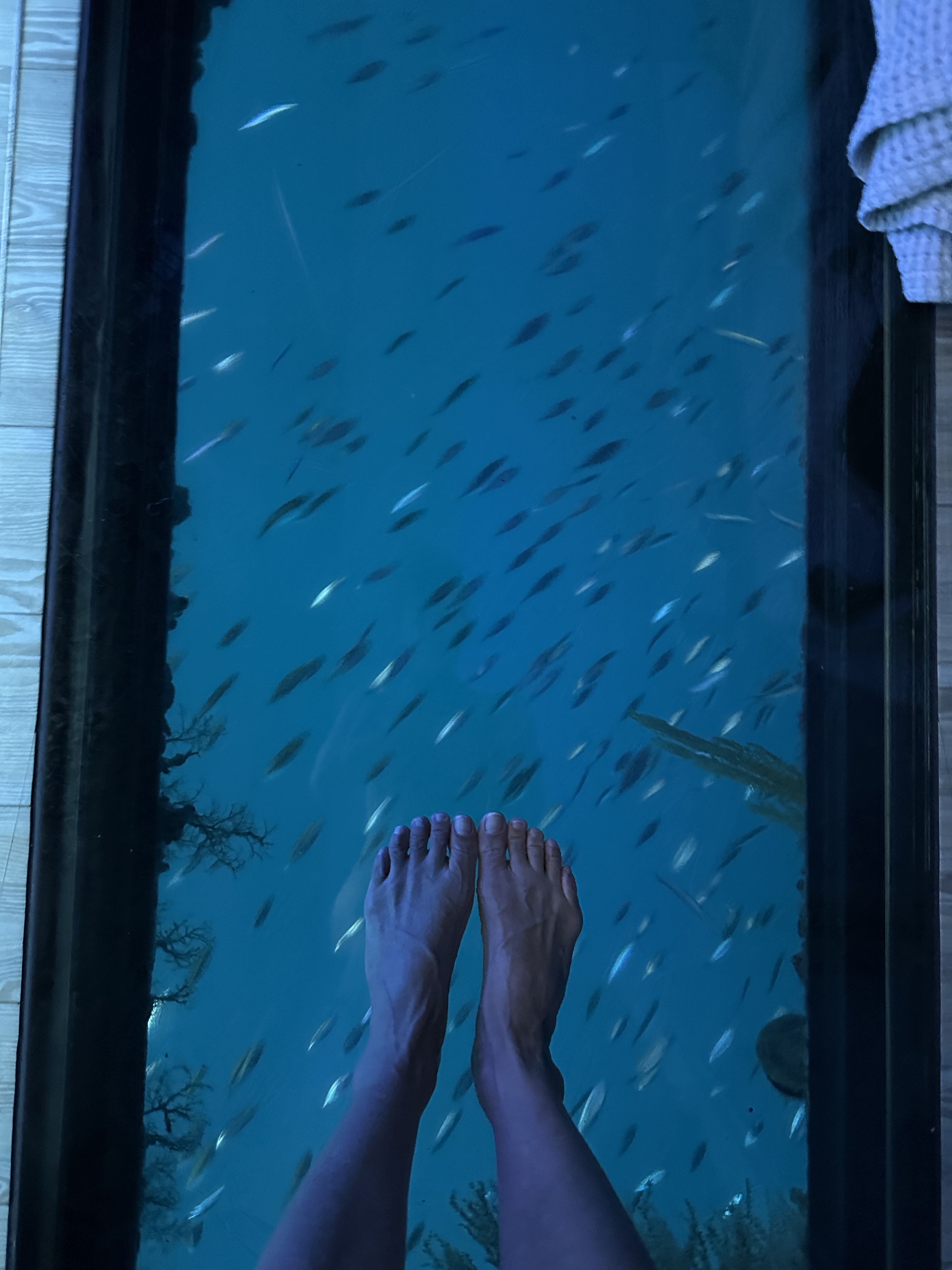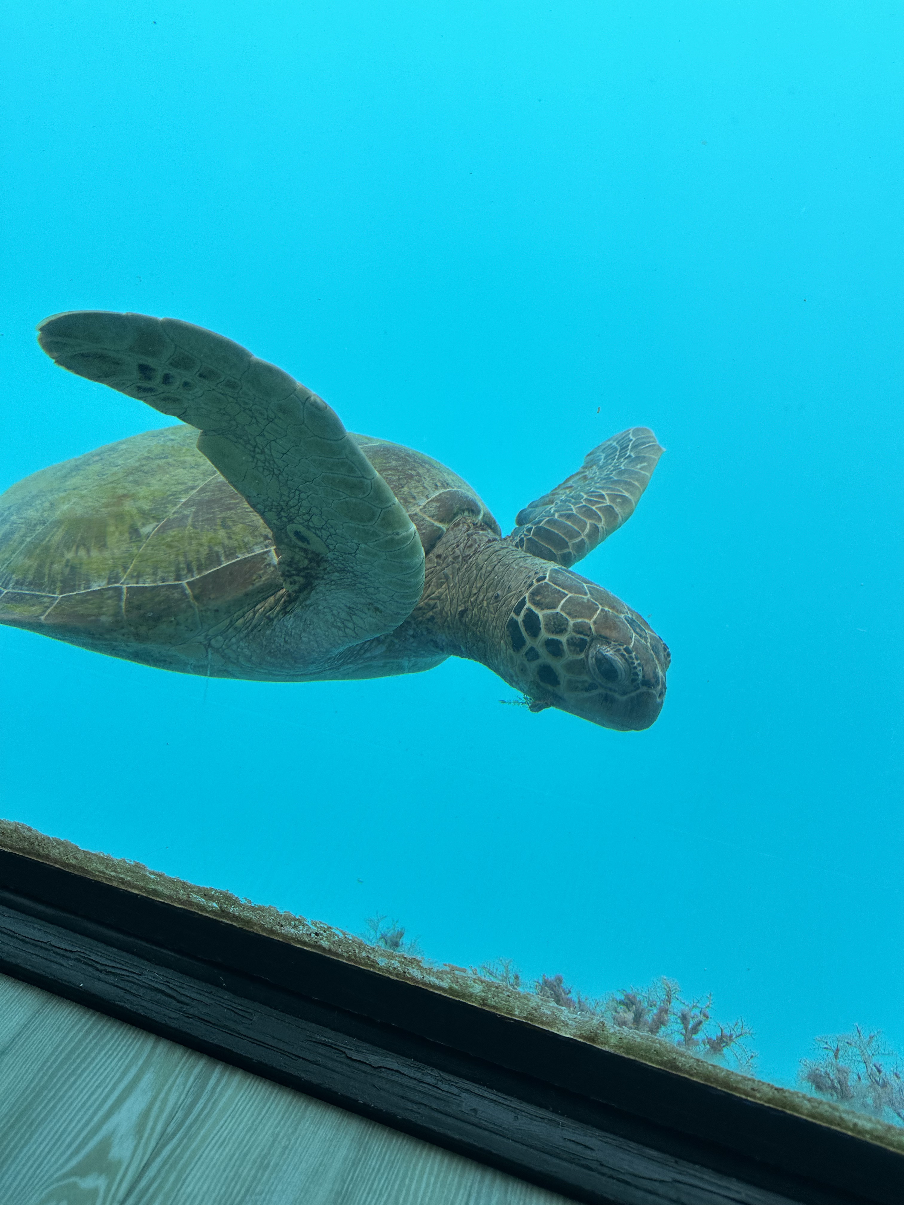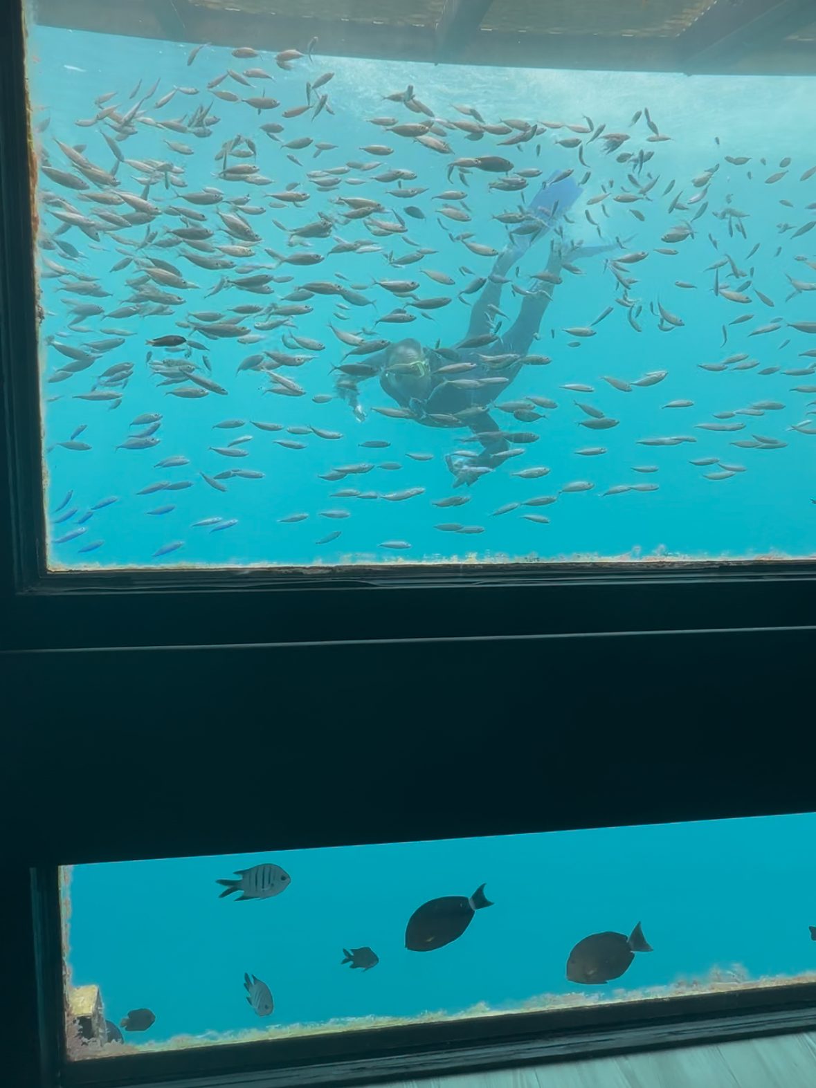 We had so much fun in our room! Overnight the sounds of the coral sounded eerily like glass popping, and if you happened to wake up for a second and open your eyes, you might just find yourself awake for hours, staring mesmerized by the fish! In fact around 2:30am after being awake for about 45 minutes I hear Jake whisper “Kris? Are you awake?” and I’m like “Yes, for awhile, what about you? I can’t stop watching the ocean.” That is when we realized we had both been up awhile just trying to be quiet for the other. So then we sat up and watched the show together finishing our champagne from the night before!