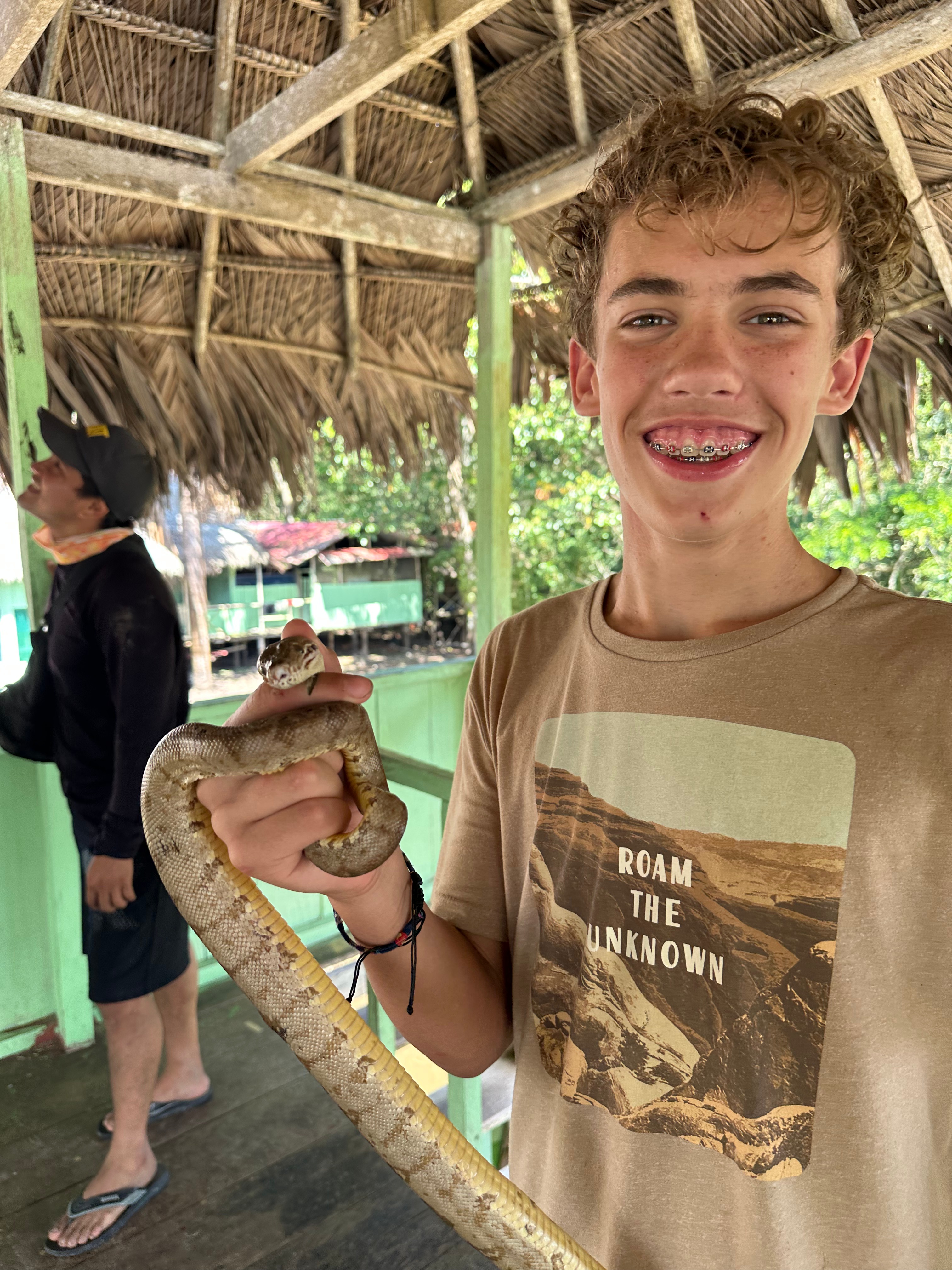 The setup is pretty bare bones, there are couple spots made for congregating with the other guests, then each room has walls but ceiling is open air (but covered), mosquito nets on the beds, and a personal bathroom. Here’s what had us confused: our toilet water was brown like the rivers water so us and a couple other guests were pondering where it led to after. I mean taking a river swim feels a lot different if I consider our toilets might be leading directly to it… so finally we just asked! And it turns out that they have a septic system, duh. We met more travelers while at the lodge, each on different days of their trip. One guy was on his last few days of 14 days at the lodge! They had to get a little more creative with him to find “new experiences”!