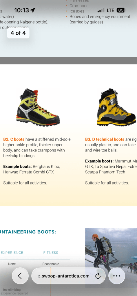 As soon as I saw the boot examples, the memory came rushing back. Jake and I were sitting at the kitchen island on a Zoom call with our booking agent. We talked through all the requirements—the necessary fitness levels, the equipment, everything. When she brought up the boots, we happily agreed it was no problem. We’d just purchase our own pair of these very specific boots before the trip.